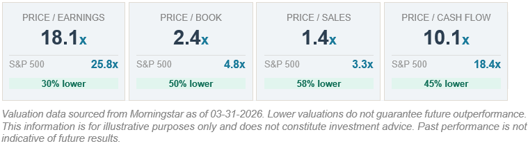 As of March 31, the equity holdings within client portfolios continue to trade at a notable discount to the S&P 500 across all four major valuation metrics. The equity sleeve is built around a mix of U.S. and international ETFs tilted toward value and high-profitability companies, which naturally results in lower price multiples than a broad market index dominated by large-cap growth stocks.