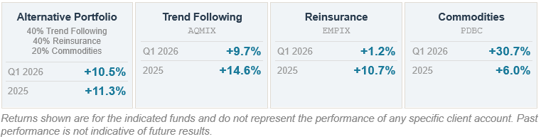 The standout was commodities (PDBC), where the oil spike associated with the Middle East conflict sent energy-linked holdings sharply higher — the same event that hurt equities was a direct tailwind here. This is a textbook example of the role commodity exposure plays: an event that creates turbulence in stocks can simultaneously act as a ballast elsewhere. Trend following (AQMIX) also had a strong showing, benefiting from clear directional moves across currencies and commodities during the quarter. Reinsurance (EMPIX) contributed modestly — its returns are driven by insurance risk and natural catastrophe events, entirely independent of equity markets or oil prices, and that's precisely the point.